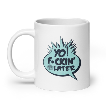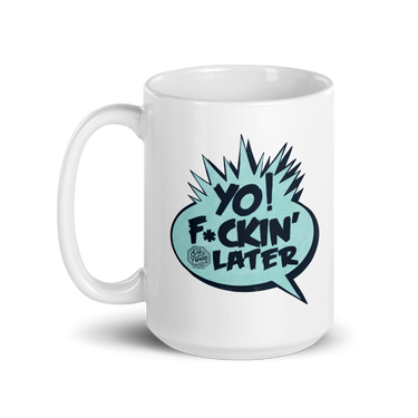Sip your coffee, tea, or whatever with a Yo! F*ckin' Later White Mug from the Anik & Florian Podcast! This bold and glossy mug makes a statement with its vivid print, and it's durable enough to handle the microwave and dishwasher. Take a risk—get one today!
